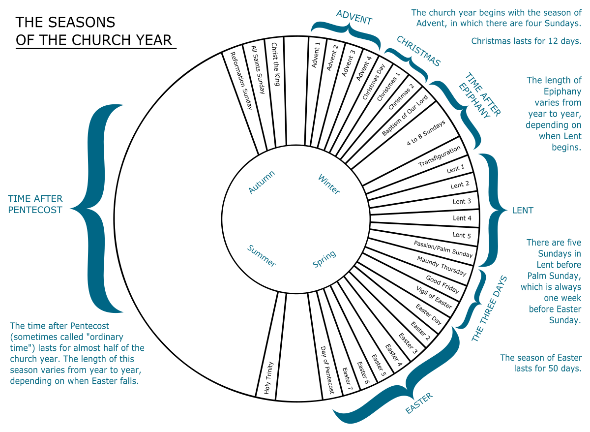 The ‘liturgical cycle’ divides the Christian year into a series of seasons, each with its own mood, theological emphasis, and modes of prayer. Each can be signified by different ways of decorating the church, choice of pulpit falls, scriptural readings and themes for preaching.